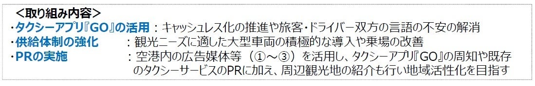 1月14日~3月31日の期間において、昨年から開始したタクシーアプリ『GO』の更なる活用に加え、大型車両の積極的な導入や乗場の改善などにより、インバウンド旅客のニーズにより対応したスマートで快適なタクシー移動の実現を目指します。