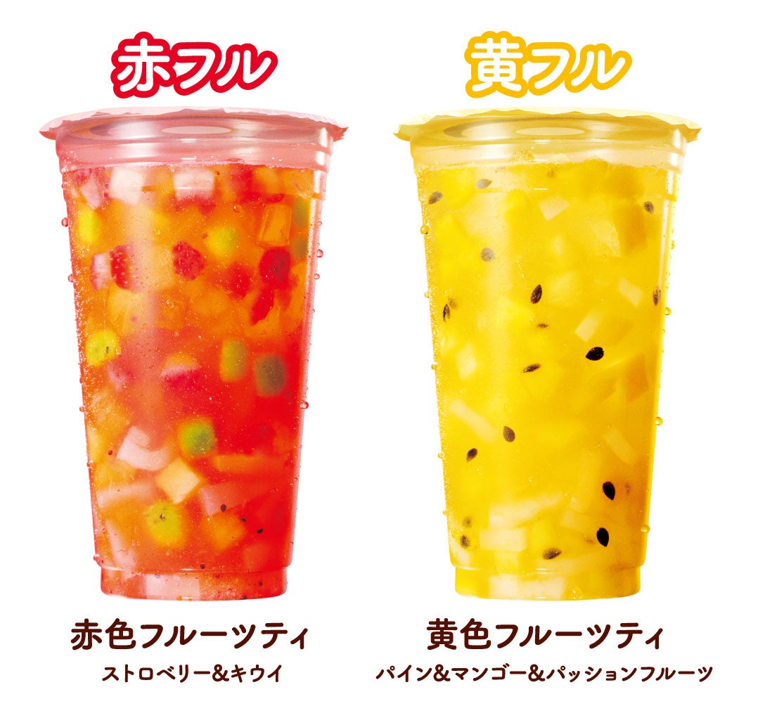 ストロベリーとキウイの果肉にアールグレイティが合わさり台湾産レモンの風味が加わった甘みとろける「赤色フルーツティ(通称:赤フル)」、パイン・マンゴー・パッションフルーツのトロピカルなフレッシュさと酸味にジャスミンティが旨味を引き立てる「黄色フルーツティ(通称:黄フル)」の全2種をご用意しました。今年のフルーツティはフルーツとアイスティのバランスを改良したことで、よりすっきりとした味わいとなっています。