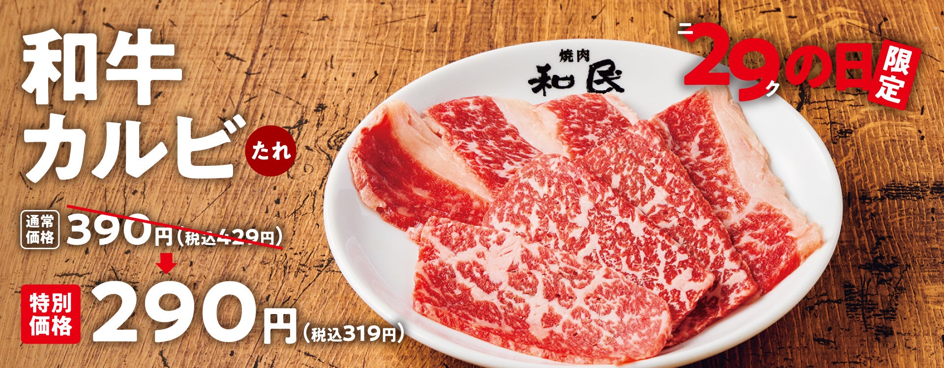 【焼肉の和民】 2023年最初の「ニクの日」は「和牛カルビ」を290円(税込319円)で‼