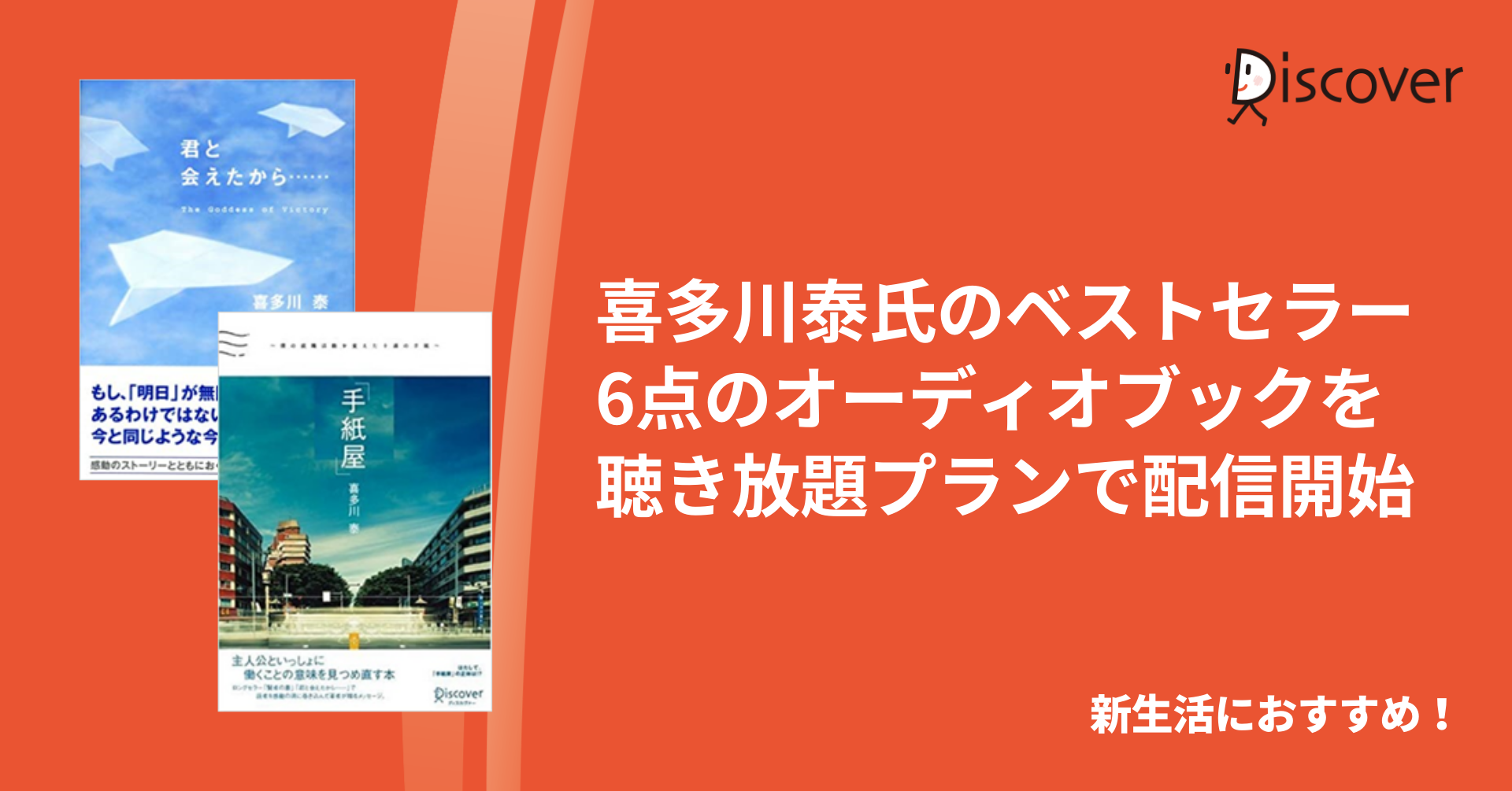 株式会社ディスカヴァー・トゥエンティワン(本社:東京都千代田区、取締役社長:谷口奈緒美)刊行の、喜多川泰氏のベストセラー6点のオーディオブックを、Amazonオーディブルとaudiobook.jpにて、聴き放題プランに追加しました。