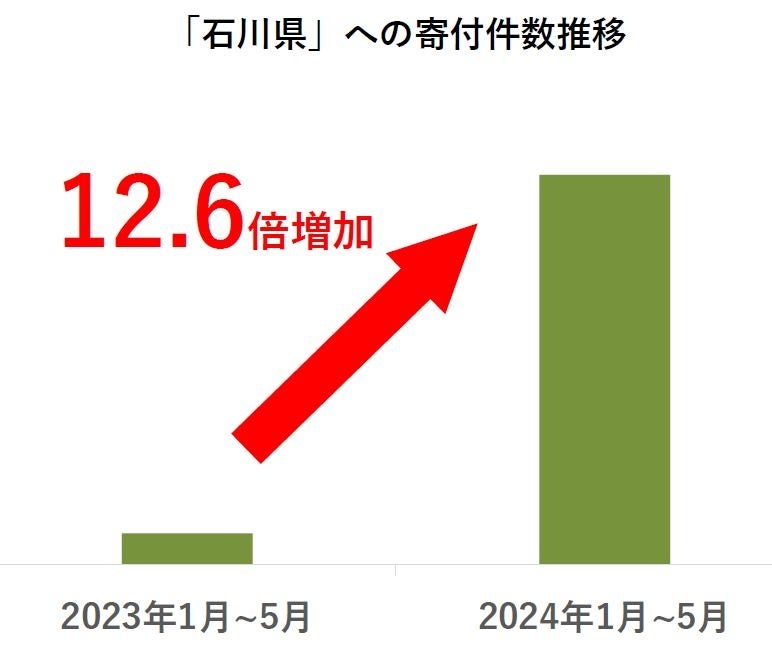 2024年1月の能登半島地震で被害を受けた石川県への1月~5月の寄付額は、昨年同期比12.6倍に増加しており、多くの寄付者が応援・支援を目的に寄付先として選んでいることが分かります。被災地で作られたお礼品を贈り物にすることで、復興に向けたお礼品事業者への支援にもつながります。