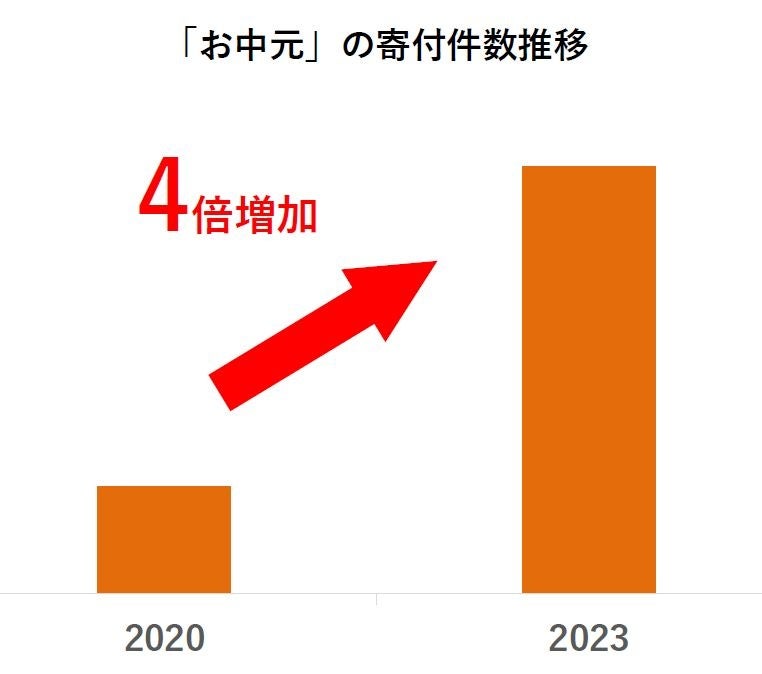 「さとふる」でタイトルなどに「贈答用」が含まれるお礼品の寄付件数は2020年と2023年を比較して約2倍、「お中元」が含まれるお礼品の寄付件数は同期間で比較して4倍に、それぞれ増加しています。