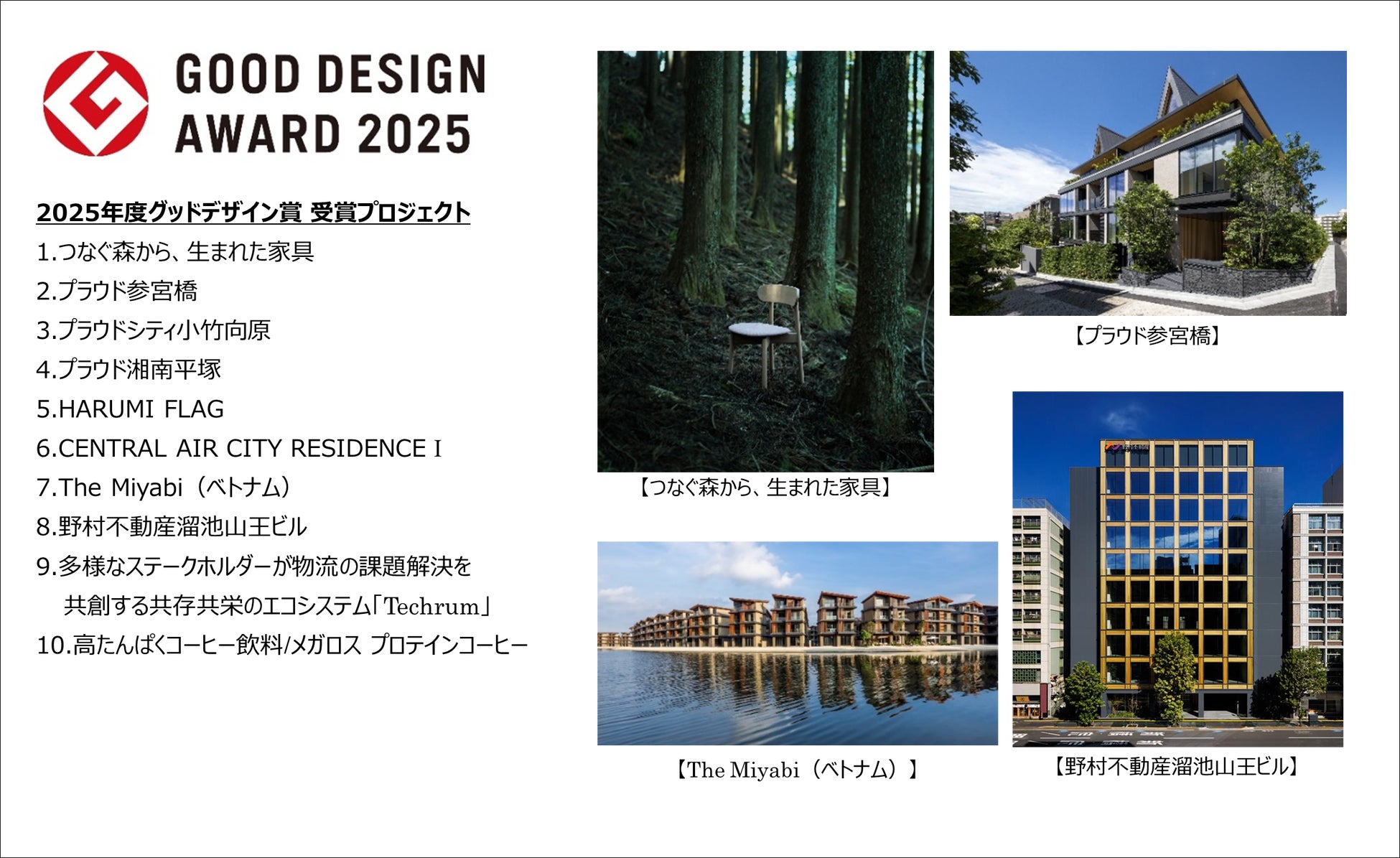 本年度は、野村不動産グループが東京都・奥多摩町に保有し、森林経営から木材活用を担う「つなぐ森」の針葉樹未利用材を用いた家具や、住宅部門では「プラウド参宮橋」ほか5プロジェクト、海外部門では初の受賞となる、現地化された日本コンセプトデザインを実現したベトナム北東部ハイフォン特別市Vu Yen島での戸建住宅開発「The Miyabi」など、グループ全体で合計10プロジェクトが受賞しております。今後も野村不動産グループでは、グループ企業理念にも掲げる「未来(あした)につながる街づくり」を通じて、社会に向けた新たな価値を創造してまいります。