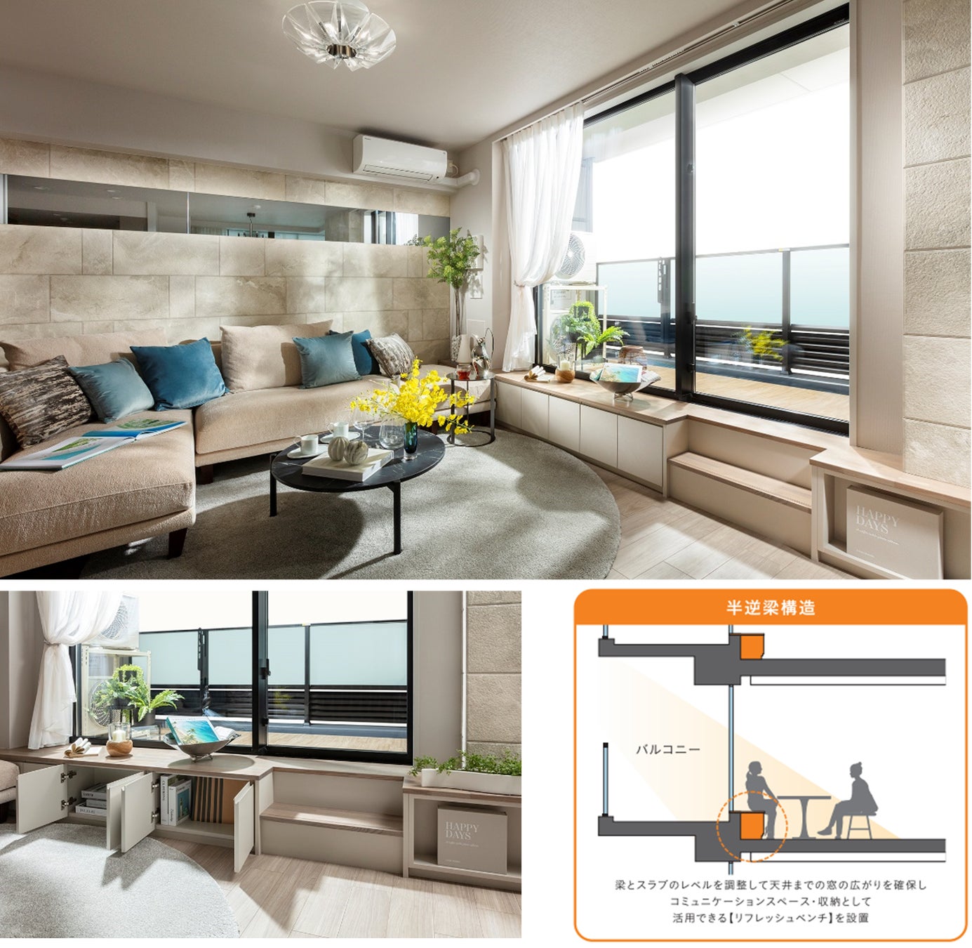 伝統的な日本家屋の「縁側」のように、マンションでも日当たりと通風に優れた場所で住戸のウチとソトの繋がりを感じる時間を創造する。そんな発想から、逆梁構造を進化させた半逆梁構造を活用し、バルコニーとの段差に収納付のベンチを設えることで、屋外の空気感を味わうとともに、趣味やコミュニケーションの場として活用できる場を創出した。