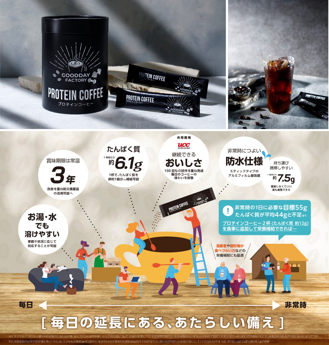 災害時に不足しがちなたんぱく質を、日常的に親しまれているコーヒーを通じて自然に摂取できる高たんぱく保存飲料。嗜好性・栄養性・保存性に優れ、健康志向の生活者や高齢者の栄養支援と心の安定を両立。日常と非常時をつなぐ新しい防災備蓄食品の提案。