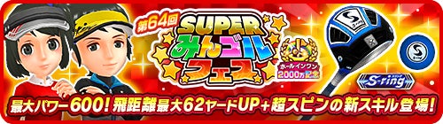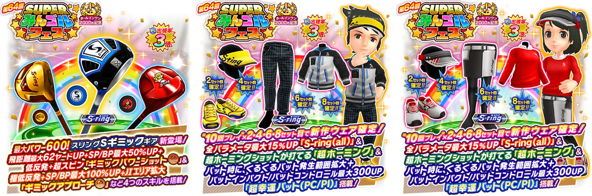 今回の「SUPERみんゴルフェス」には、「S-ring」シリーズから、最大パワーが600かつ、新アクティブスキル「ギミックパワーショット」「ギミックアプローチ」のほか、「無風(オールグリーン)」、「ティー超チャンスパワー」を搭載した新ギア「スリングSギミック」(クラブ/ボール)が登場いたします。ウェアガチャにも「S-ring(all)」「超幸運パット(PC/PI) 」「超ホーミングショット」など、複数スキルを搭載した新作ウェアが登場。さらに「10回プレイ」2・4・6・8セット目で新作ウェアが確定となります。ぜひ、ご参加ください!