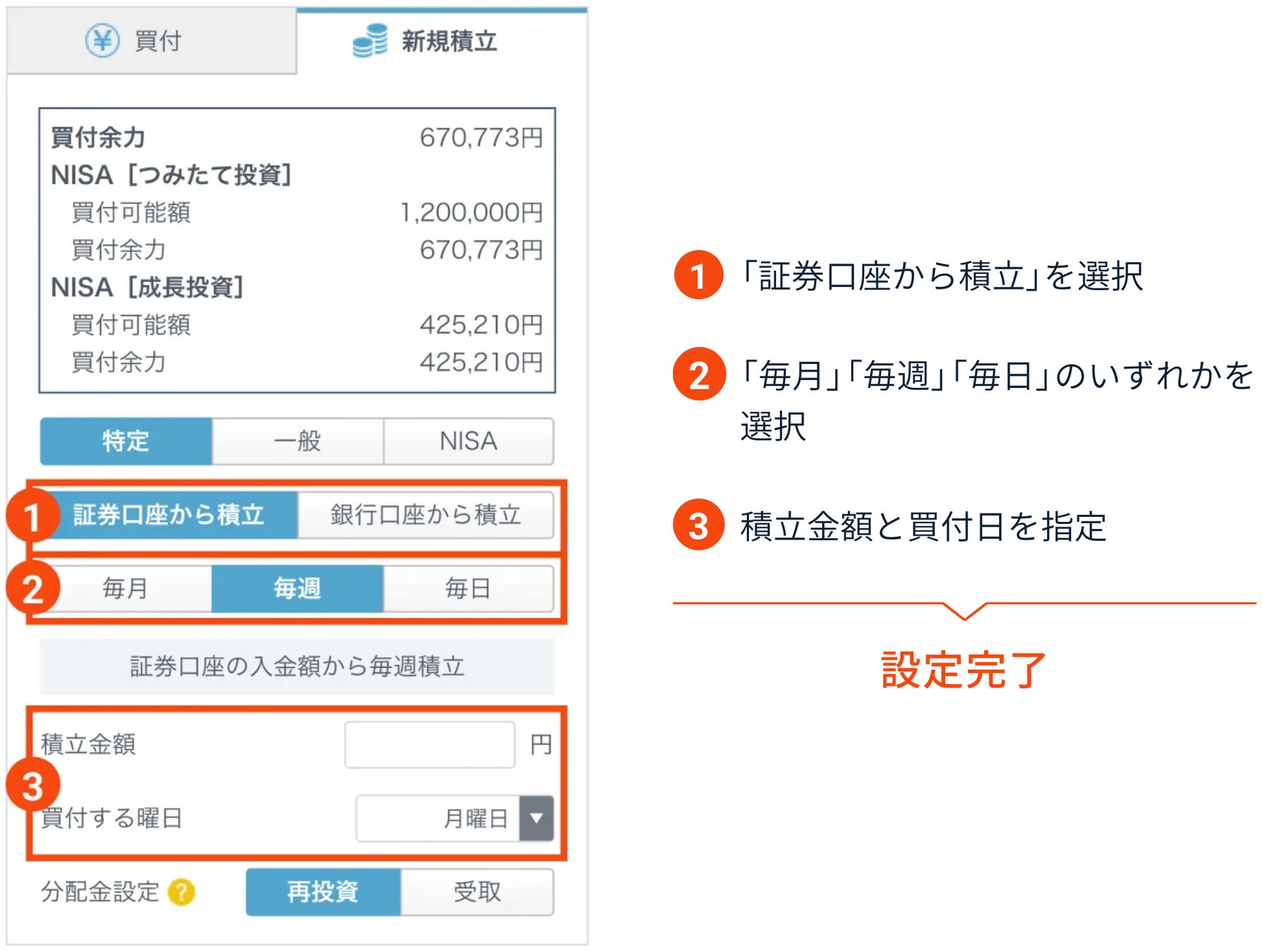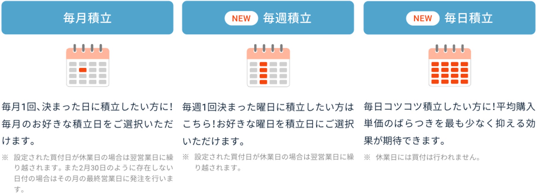 (※)毎週・毎日コースのご利用および毎月コースでお好きな日付をご指定いただくには、投信積立の設定時に「証券口座から積立」をご選択いただく必要があります。「銀行口座から積立」をご選択の場合、設定可能な積立日は毎月5日または23日のみとなります。