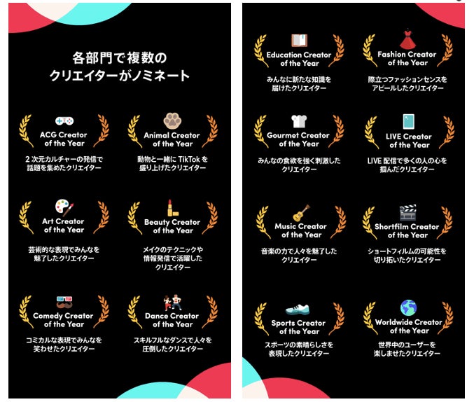 各部門ノミネート:https://activity.tiktok.com/magic/eco/runtime/release/634e05498d24a3033eb5278f?appType=tiktok&magic_page_no=1