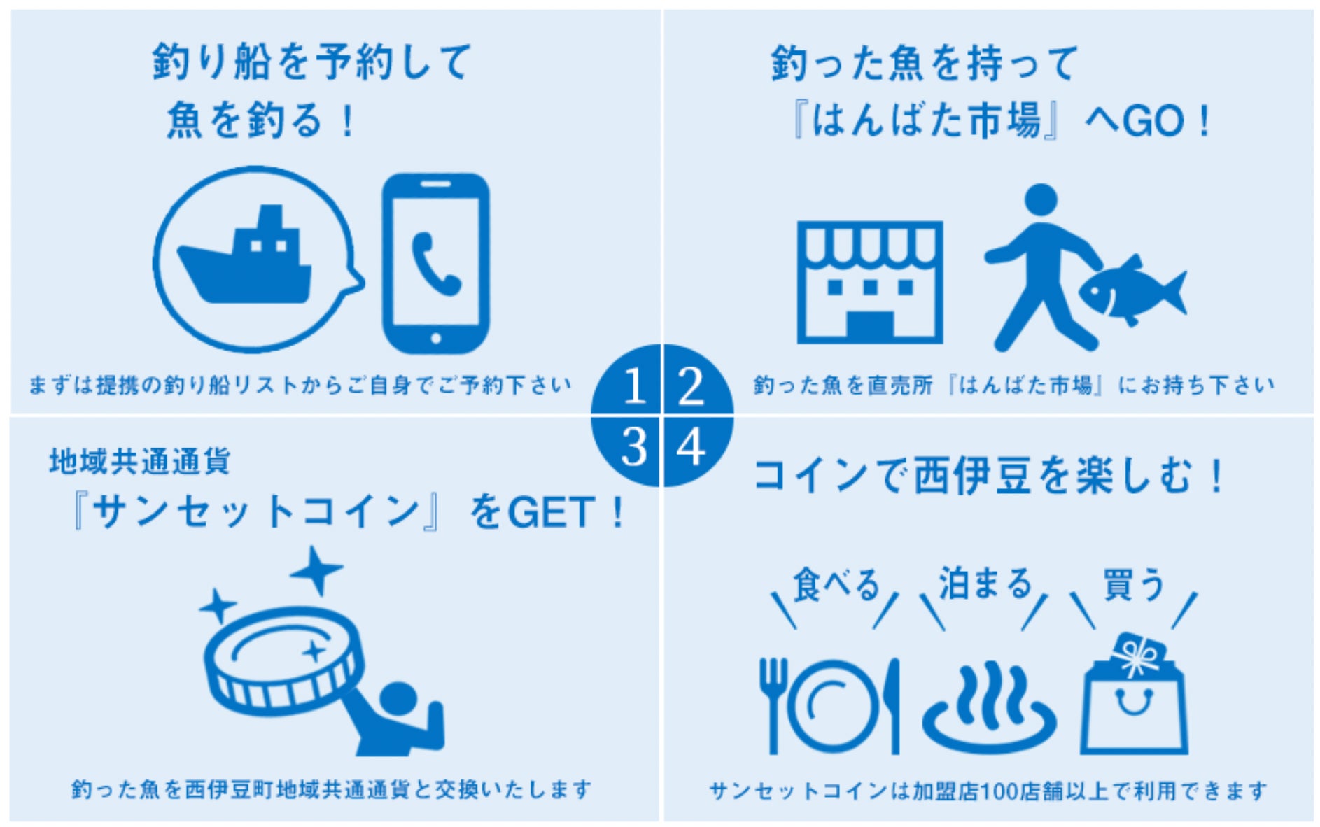 静岡県西伊豆町が釣り人や観光客が連携する遊漁船で釣った魚を、西伊豆産地直売所「はんばた市場」で電子地域通貨「サンセットコイン」と交換する(買い取る)取り組み。新型コロナウイルスで激減した観光還流の促進と、漁師不足による漁獲量低下の解決を目的に、2020年からスタートしました。
