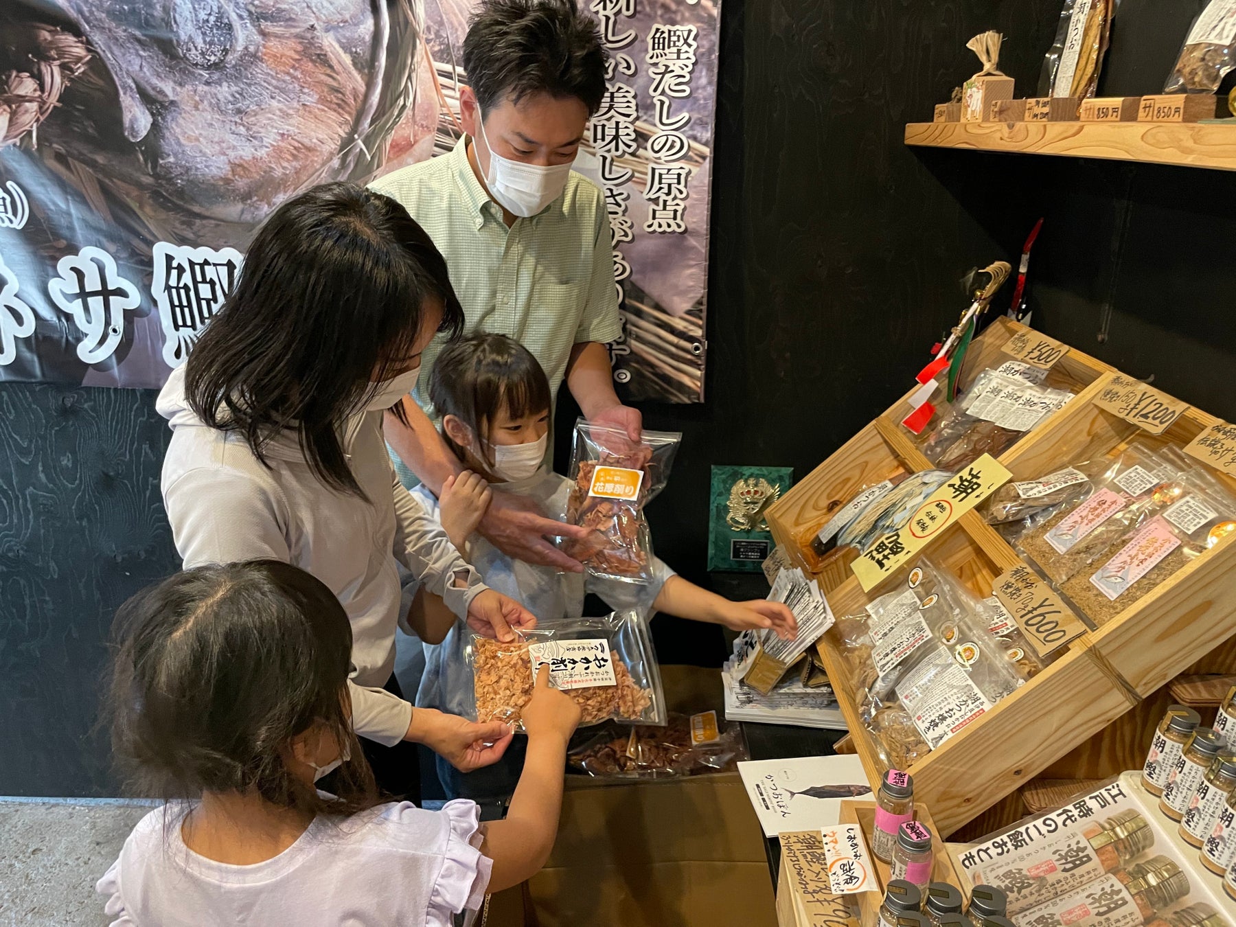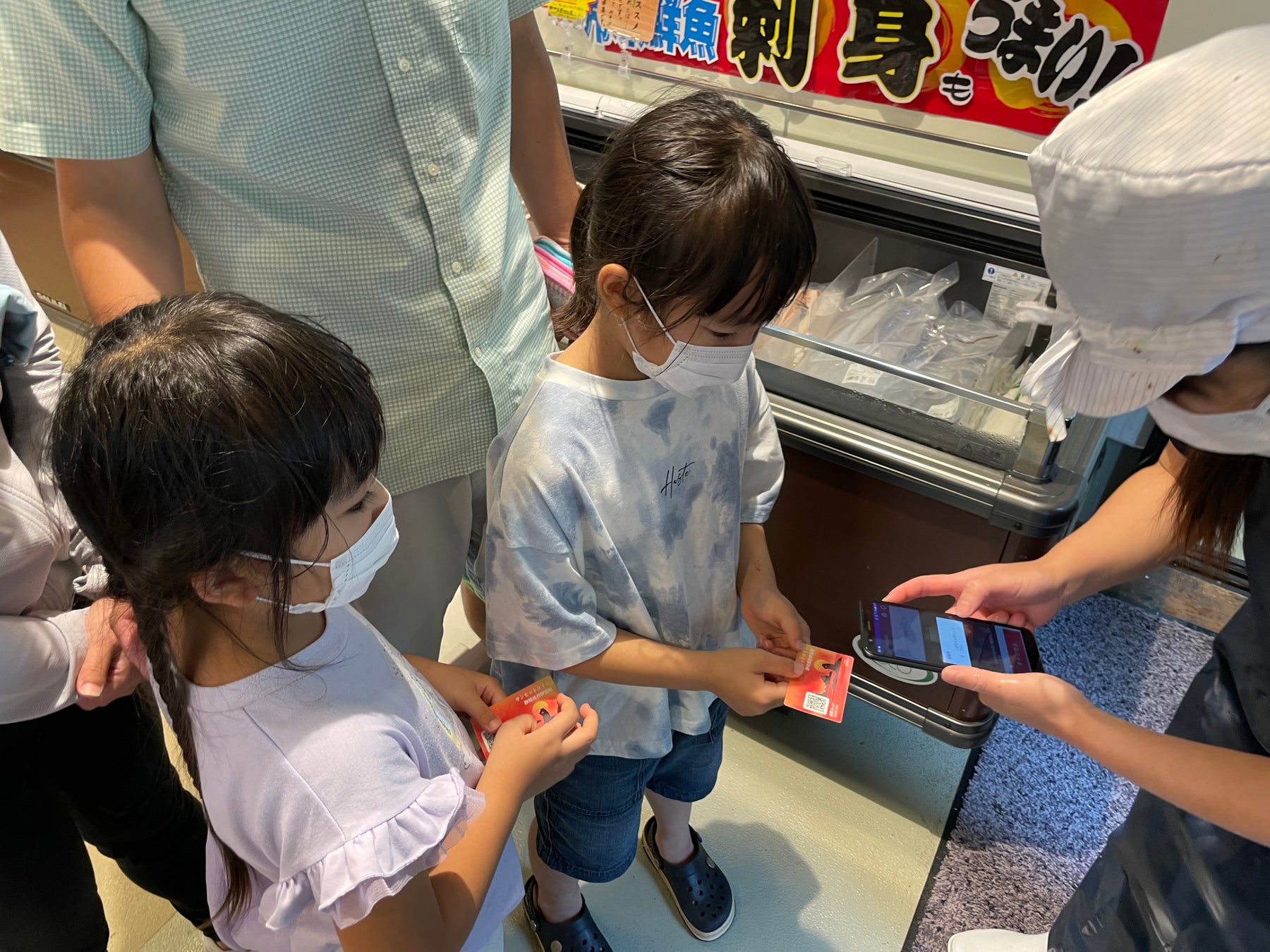 11:30 はんばた市場で魚の買い取り体験。釣った魚をメダル(電子地域通貨)に交換