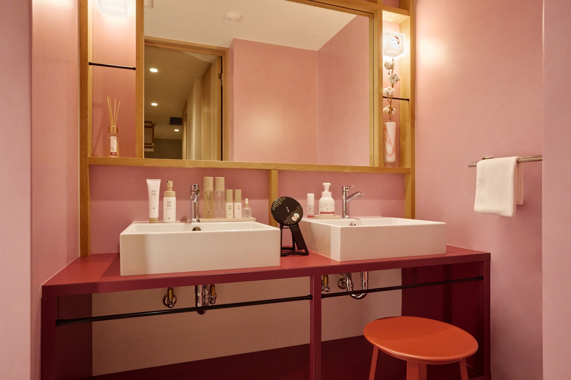 じっくりと身支度を整える空間として、美意識と向き合うためのパウダールームを作りました。よーじやのフェイシャルケアブランド「su-ha(すーは)」の商品が並び、自分の肌悩みや好みの使用感に合ったスキンケアを見つけることができます。そのほかにも手間ひまをかけて身支度をするためのアイテムが並びます。また、バスルームにはよーじやのバスアイテムが並ぶため、頭からつま先までよーじやアイテムでトータルケアできます。テンションあがる空間で楽しくセルフケアを行い、翌日の観光も良いコンディションで楽しめます。