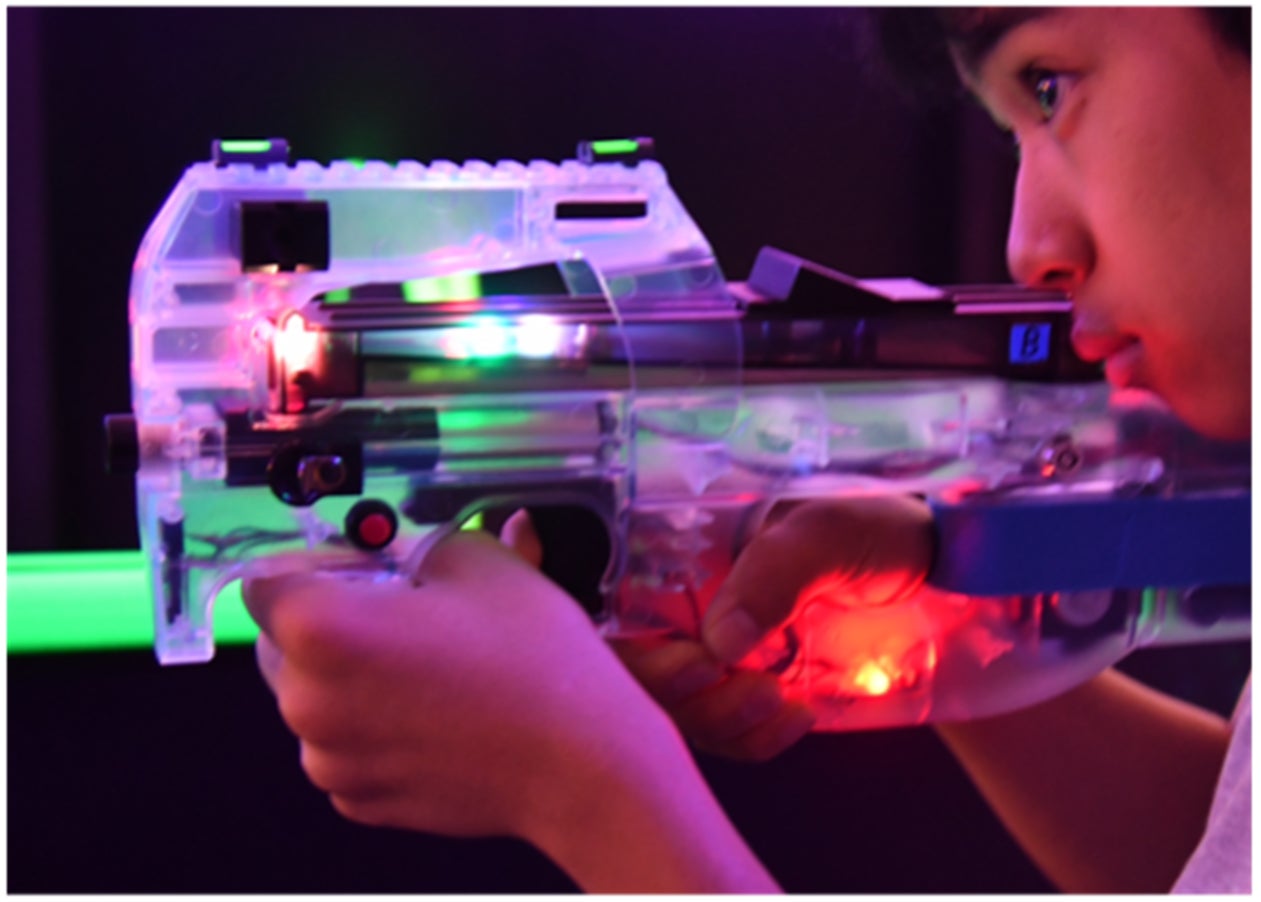 赤外線を使用したハイスペックレーザーガンでプレイしますが、けがや痛みの心配がなく、装備品も不要ですので、子ども同士でも、ファミリーでも安心・安全にサバイバルゲームが体験できます。初めての方には専属のスタッフが丁寧な説明を行い、どなたでも楽しんでいただけるようサポートします。また、プレイ中にはスタッフがマイクパフォーマンスで対戦を盛り上げてくれます。