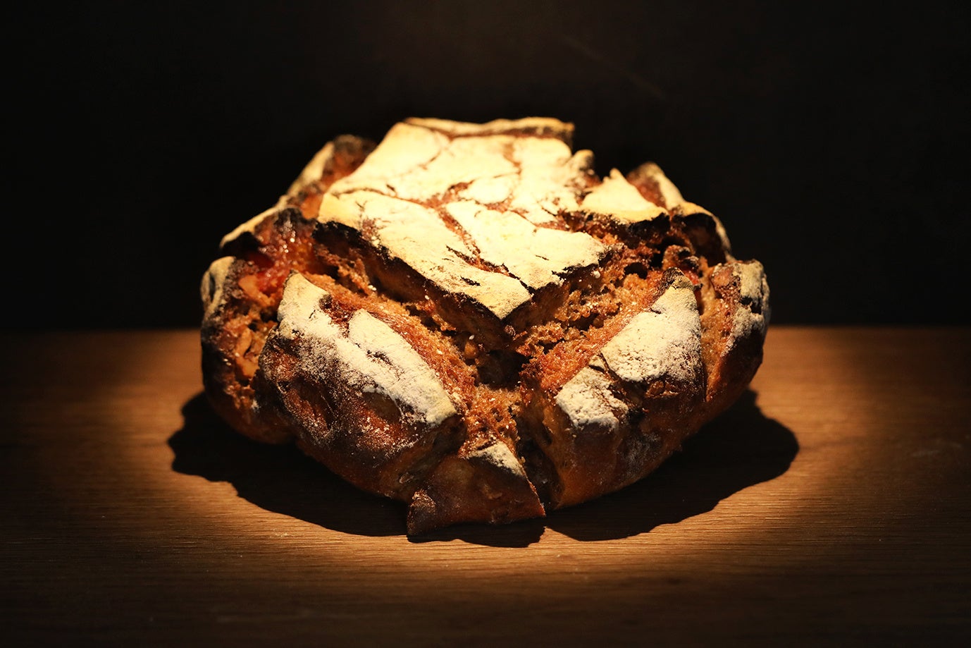 こだわり:ライ麦粉を60%使用した、酸味が強いずっしりとした噛み応えのあるドイツパンです。旨味が詰まった干し柿とクルミを混ぜ込んでお召し上がりいただきやすく、食感もお楽しみいただけるよう仕上げました。干し柿の程よい甘味とライ麦の酸味が絶妙にマッチする逸品です。