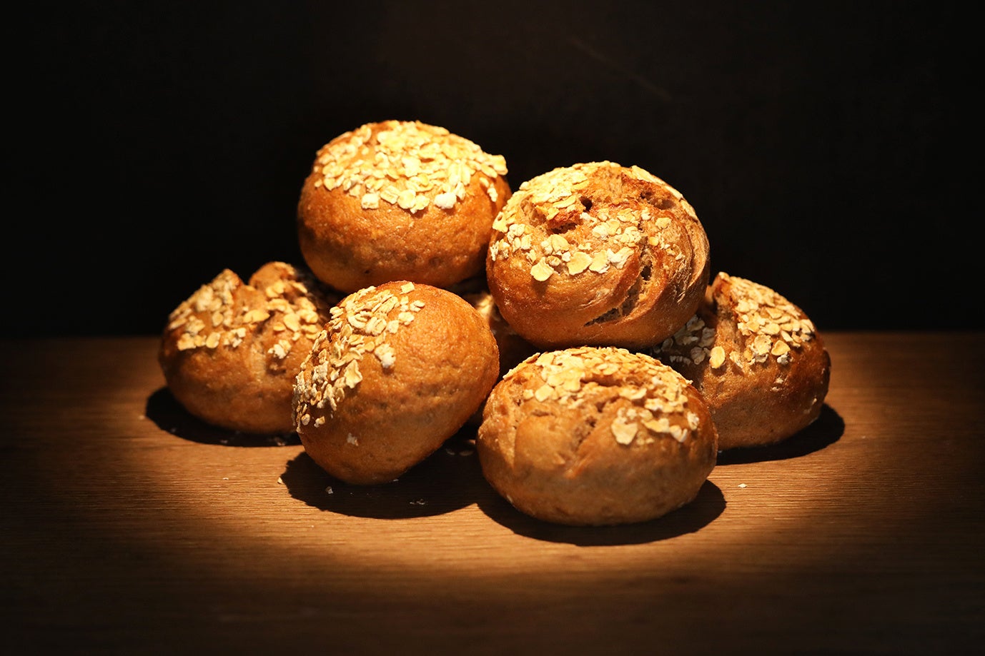 こだわり:ライ麦粉を60%使用した、酸味が強いずっしりとした噛み応えのあるドイツパンです。ライ麦パンが初めてのお客様にもお試しいただきやすいようプチパンもご用意いたしました。生地にオートミールを練り込み、さらに表面につけて焼き上げているため、健康志向のお客様にもおすすめです。