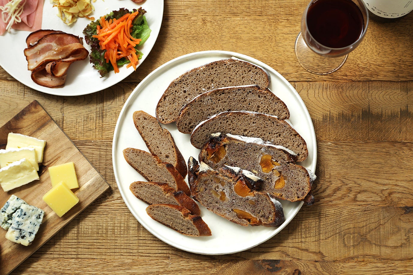『スペシャリテ』シリーズは、そのままでももちろん、0.8cmほどに薄くスライスしてオープンサンドなどのアレンジもお楽しみいただけます。十分に感じられる酸味を活かすために、合わせる具材もブルーチーズや生ハム、パテなどしっかりとした味わいの具材を組み合わせていただくのがおすすめです。また、バゲットラビットで販売している赤ワイン『ランブルスコ・レジャーノ・ビオ・アマービレ』とのペアリングもよく合います。