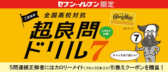 (4)要領 参加者には出題される問題に超良問ドリルLINEアカウント内で回答いただき、5問連続で正解すると、大塚製薬提供の「カロリーメイト ブロック(2本入り)」とお引き換えいただける引換クーポン*を進呈(挑戦できる回数は最大7回までです)。