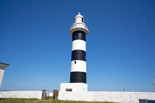 日本海を望む男鹿半島に建つ白黒のシマ模様をした灯台。全国に16基ある参観灯台の1つ。初点灯100周年を記念して設置された灯台資料展示室では、当時使用していたレンズほか灯台の関係資料を閲覧することができます。