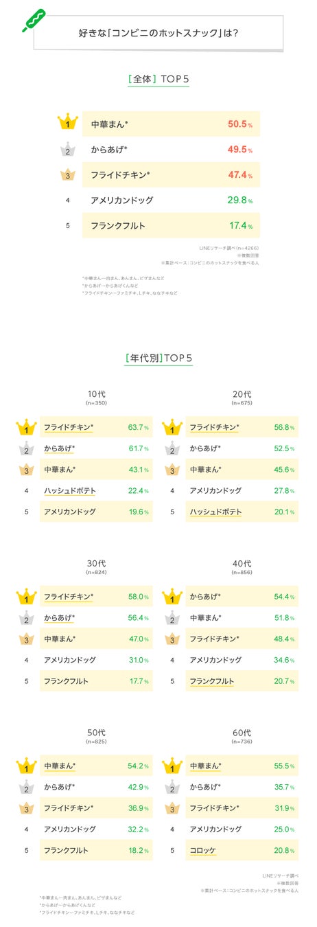 全体のTOP3は、いずれも5割前後の高い割合で「中華まん」「からあげ」「フライドチキン」という結果でした。