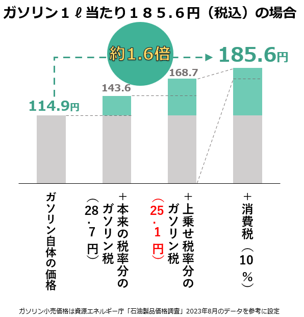 さらにガソリン税に対しても消費税が課税されており、小売価格はガソリン自体の価格の約1.6倍となっている。