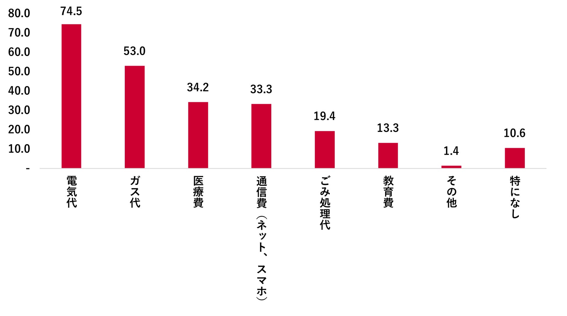 今後、水道以外で無償化や補助を希望する公共サービスについて尋ねたところ、最多は「電気代」で74.5%、次いで「ガス代」が53.0%となった。生活インフラ全体への支援を望む声が強いことが分かった。