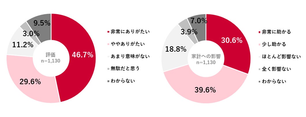 また、家計への影響については「非常に助かる」が30.6%、「少し助かる」が39.6%で、70.2%が負担軽減につながると捉えている。