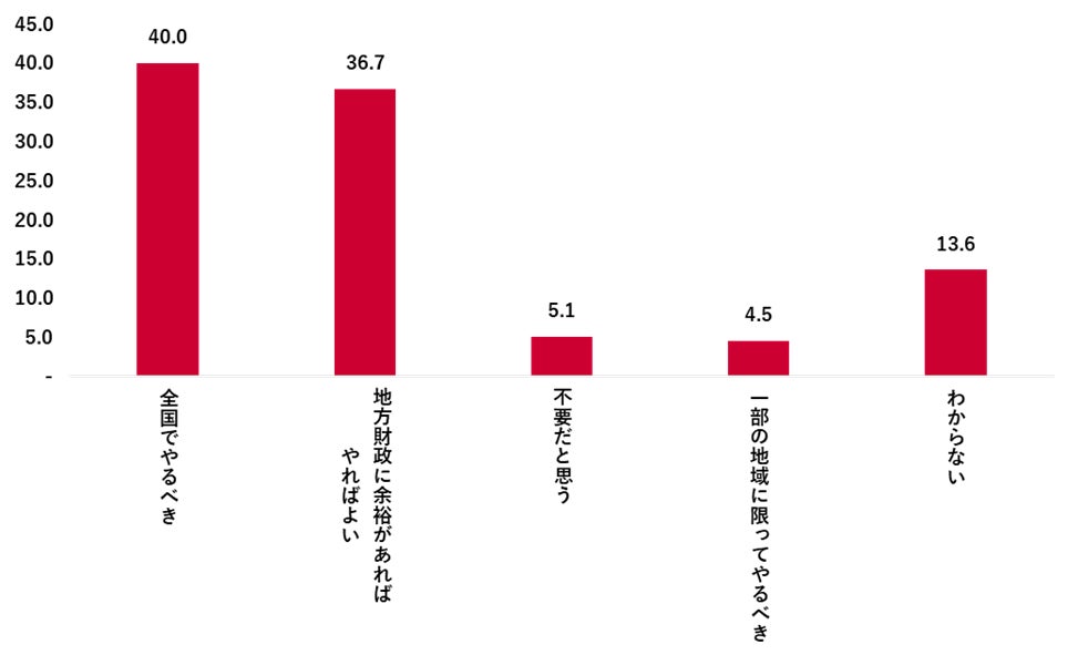 また、同様の無償化施策について、他の自治体でも行うべきかを聞いたところ、「全国でやるべき」と「地方財政に余裕があればやればよい」がそれぞれ約4割となった。