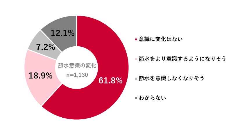 水道基本料金の無償化によって節水意識に変化があるかを尋ねたところ、「意識に変化はない」が6割超を占めた。一方で、「節水をより意識するようになりそう」と答えた人は約2割となり、意識変化が見られた。