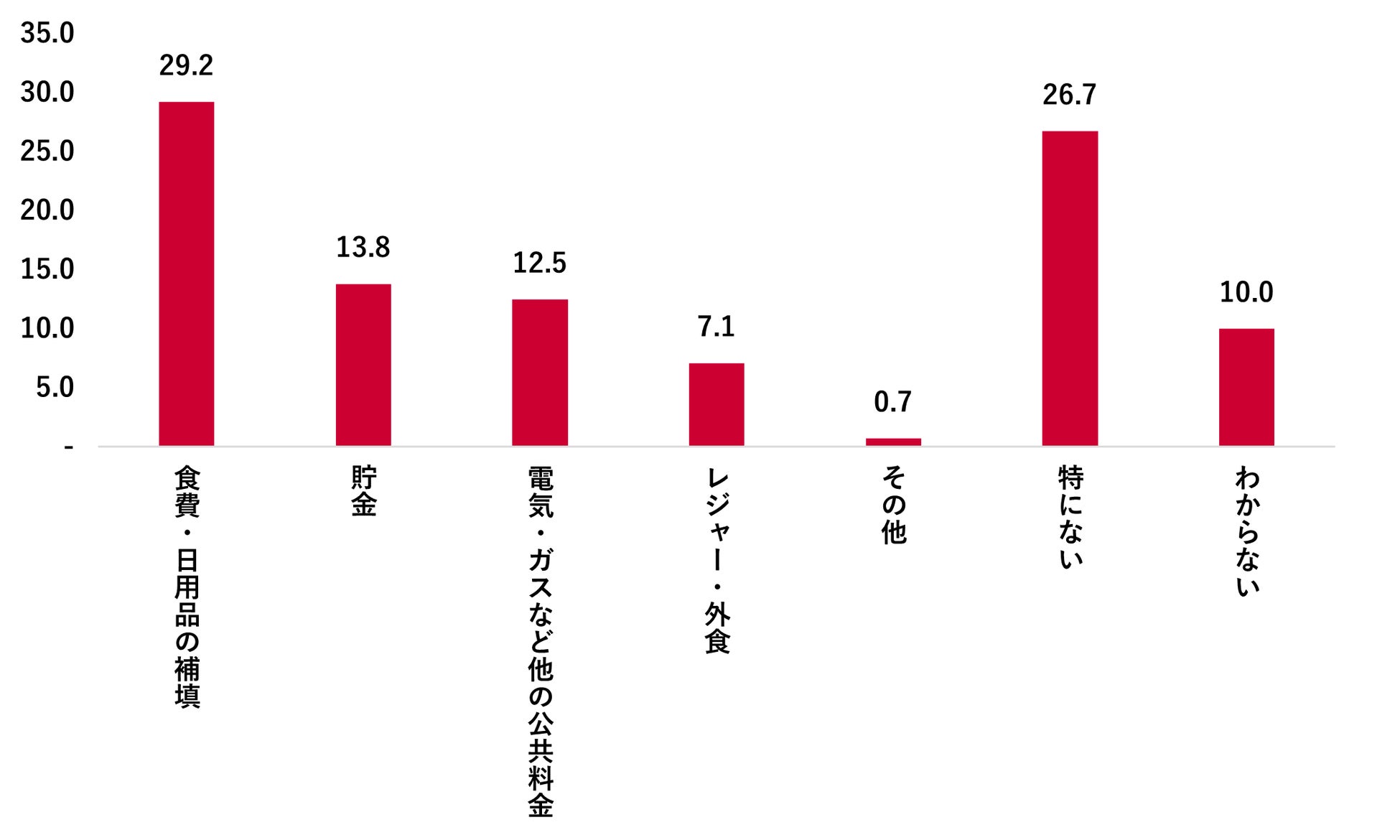 水道基本料金の無償化によって浮いたお金の使い道としては、「食費・日用品の補填」が最多の29.2%、次いで「貯金」との回答が13.8%だった。家計の中でも日々の生活費や将来に向けた備えに充てる意向が強いことがうかがえる。