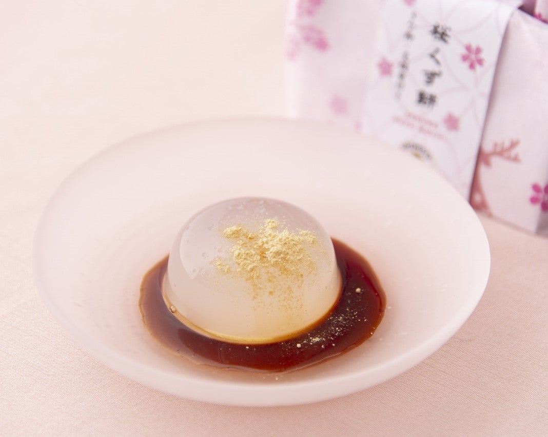 葛粉を水で溶かす前に丁寧にとおしふるいにかけ、舌触りの良いなめらかな食感に仕上げました。国産の桜の花をあしらい、春の訪れを感じさせます。軽く冷やしてお好みで黒糖蜜、きな粉をかけてお召し上がりください。