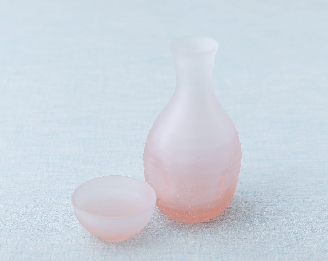 桜が吹雪くさまを表現した吹雪シリーズ。 手びねりのようなやわらかいシルエットとフロスト加工による曇り硝子が和の食卓にぬくもりを運びます。ゆるりとした形が優美な二合徳利と優美なシルエットのぐいのみ。揃えて使いたくなる上品な酒器。
