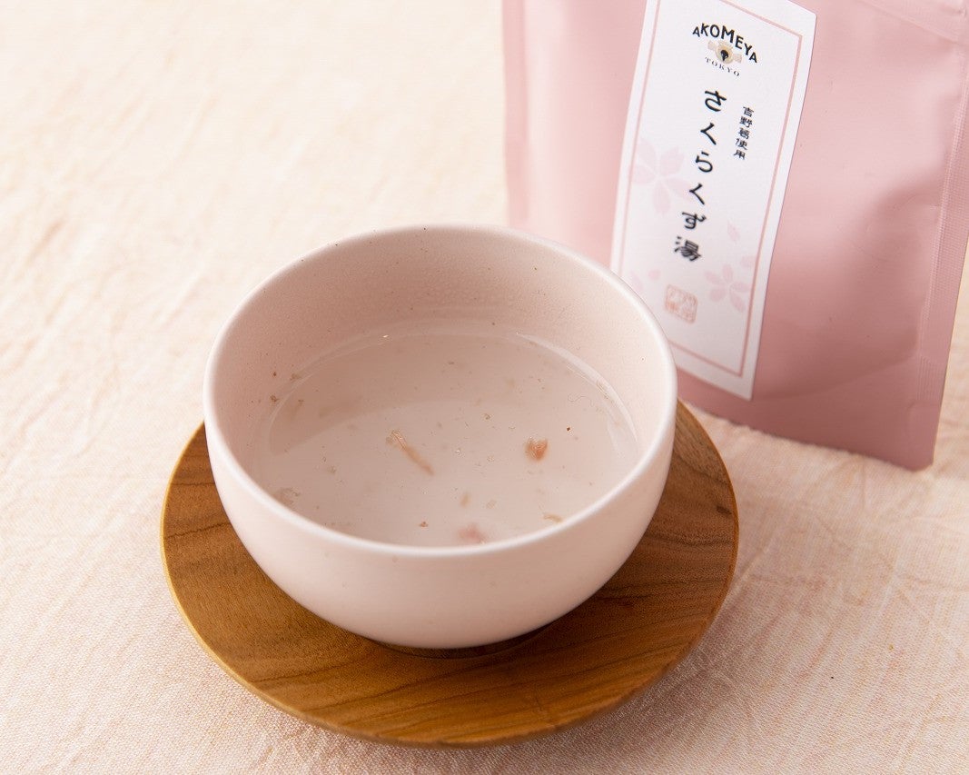 明治15年創業の奈良県 吉田屋による、吉野くず湯。桜の花びらをそっとくず湯にあしらい、淹れると桜の花びらが浮かんでくる。桜のうす塩の上品な味わいと、とろ~りなめらかなとろみ感が心も身体もあたためる一品。品のある日本らしい春の味を楽しめる。
