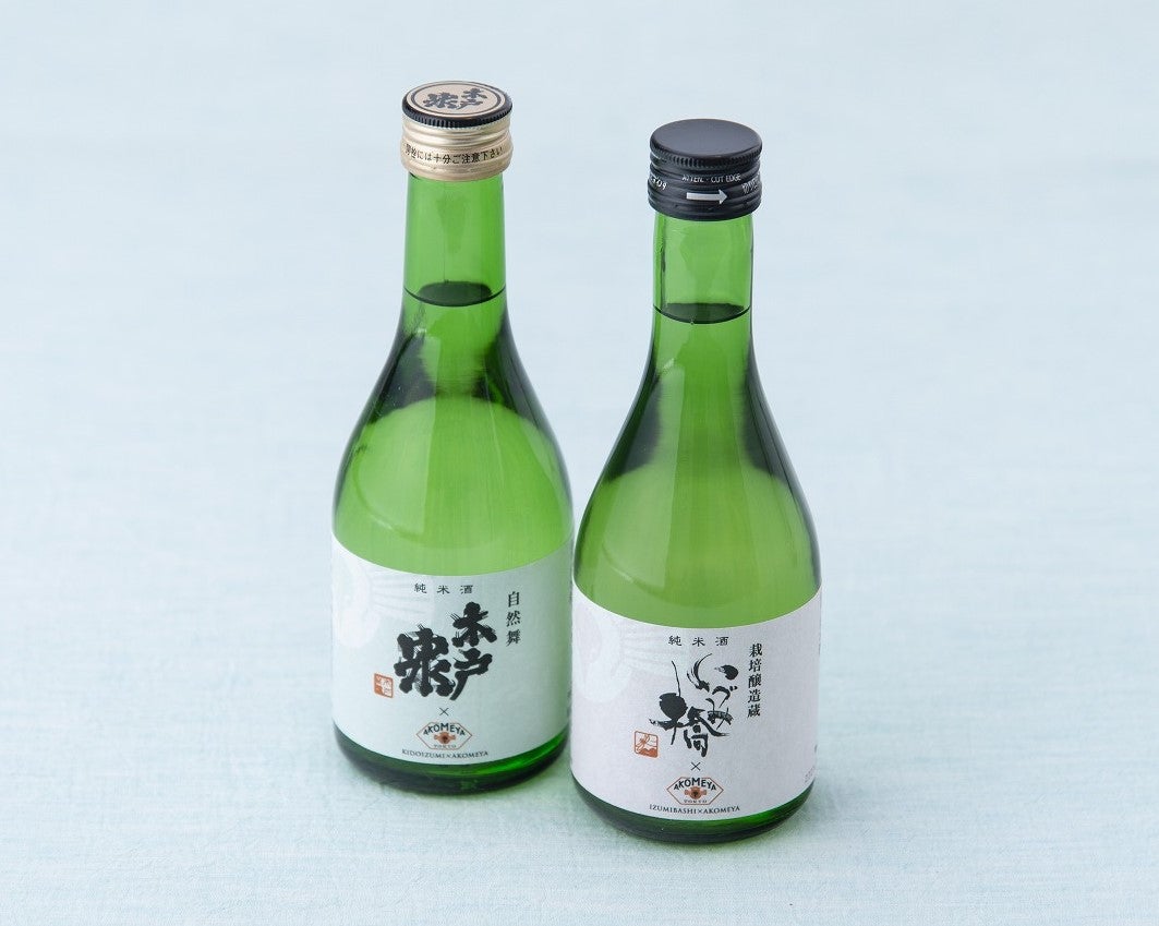 AKOMEYA TOKYOと関東の銘酒がコラボレーション。すっきりした味わいの純米酒「泉橋 栽培醸造蔵 いづみ橋」、しっかりした味わいの自然栽培米を全量使用した純米酒「木戸泉 自然舞」。気軽に飲める300mlサイズは、飲み比べてみても、贈り物にも。