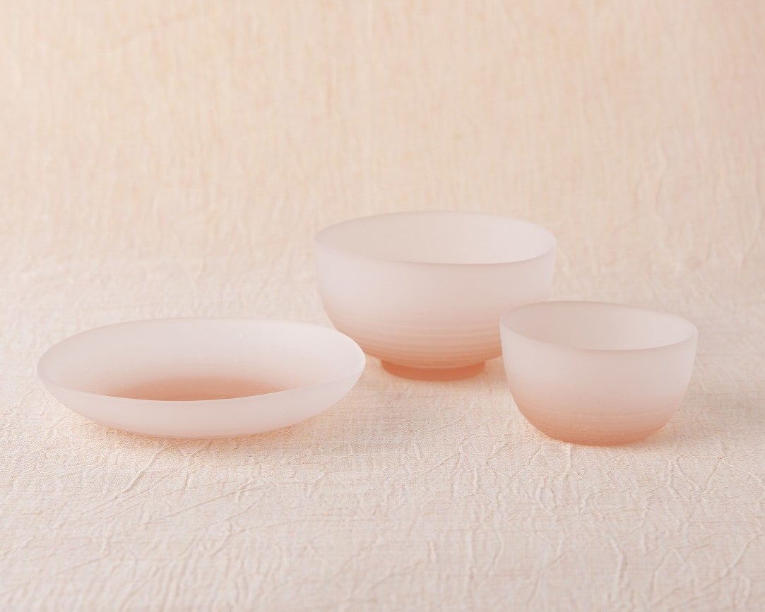 桜が吹雪くさまを表現した吹雪シリーズ。手びねりのようなやわらかいシルエットとフロスト加工による曇り硝子が和の食卓にぬくもりを運びます。 春のお茶時間にぴったりな淡い色合いと絶妙なフォルムの器たちは春のお菓子にそっと馴染み、あたたかな時間を運んでくれます。