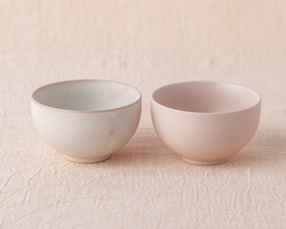 丸みのあるボウル型の煎茶碗はほんのりピンクに色づく釉薬を使用した白と、優しいピンクの2色。小春日和の晴れた日に、美味しいお茶を淹れてたのしみたい。春の訪れを感じる優しい色合いが食卓に明るさと華やかさを出してくれる。