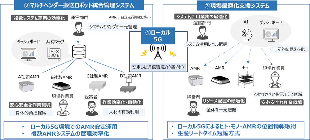 複数メーカーのAMR(注2)の工場業務に合わせた活用を統合管理の手間を掛けずに実現し、ローカル5Gによる位置測位データを活用しヒト・モノ・AMRの配置/作業工程最適化を実現することで、作業の効率化や人手不足解消をめざします。これらの実証を通して、地域における製造業の持続的成長に貢献していきます。