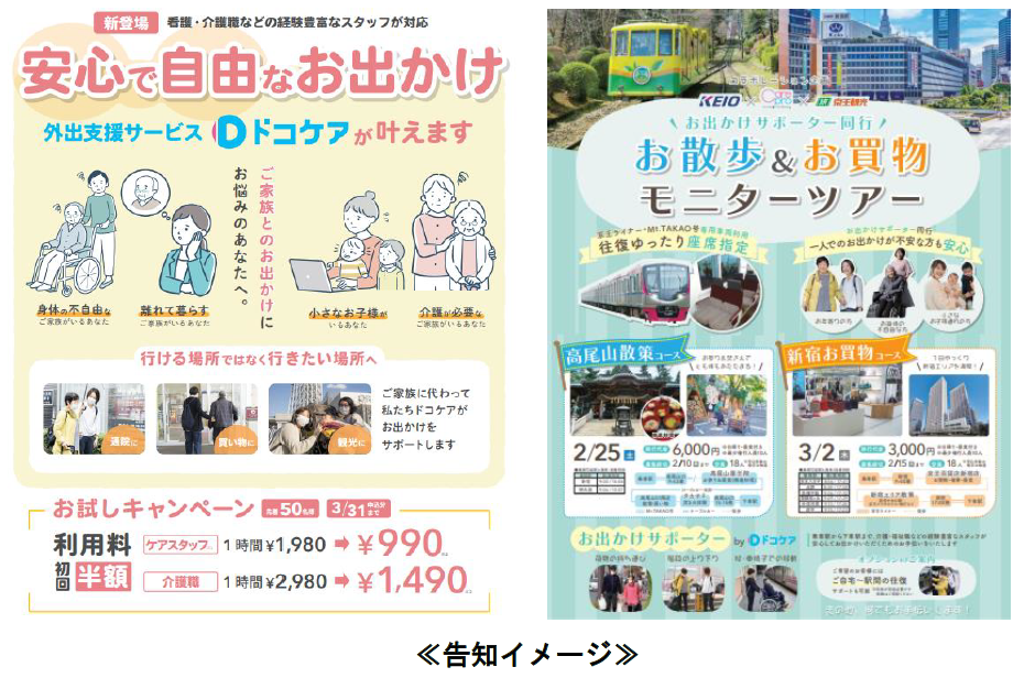 京王電鉄株式会社(本社:東京都多摩市、代表取締役社長:都村 智史、以下、「京王電鉄」)と、ReGACY Innovation Group 株式会社(本社:東京都千代田区、代表取締役:成瀬 功一、以下、「ReGACY」)は、2022年7月より開始した、スタートアップ企業をはじめとした外部企業との共創によるオープンイノベーションの実現を目指す「KEIO OPEN INNOVATION PROGRAM」の採択企業であるケアプロ株式会社(本社:東京都中野区、代表取締役:川添 高志、以下、「ケアプロ」)と共同で、1月26日(木)から鉄道利用を含めた外出支援マッチングサービスの京王電鉄版「ドコケア」のお試しキャンペーンを実施します。また、座席指定列車で行く「お出かけサポーター同行お散歩・お買物モニターツアー」として、2月25日(土)には「Mt.TAKAO号」にご乗車いただき、髙尾山薬王院への参拝や高尾山口駅前ホテル「タカオネ」での焚き火体験などを楽しむモニターツアーを、3月2日(木)には「京王ライナー」にご乗車いただき、京王百貨店でのお買い物等を楽しむモニタ