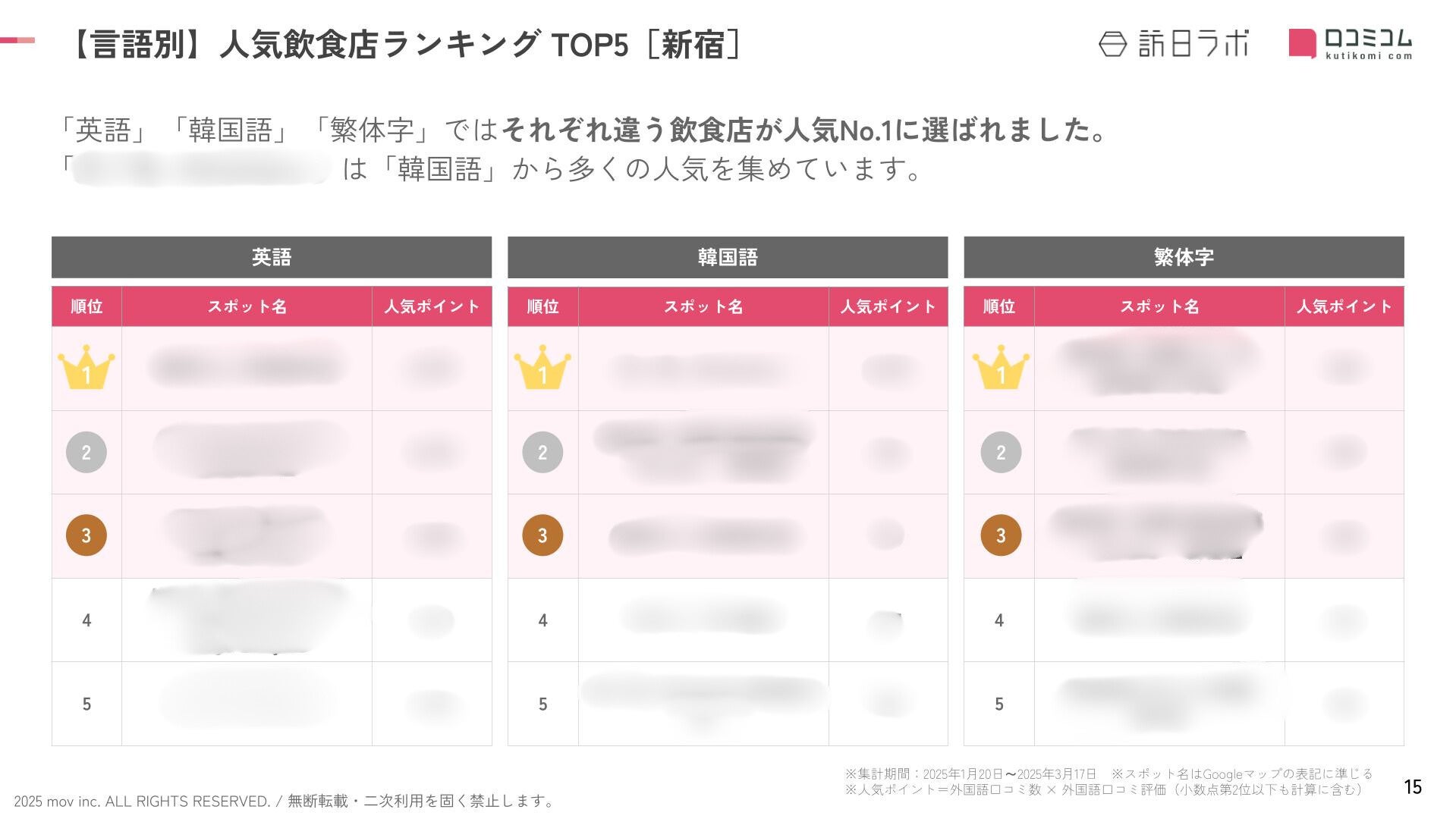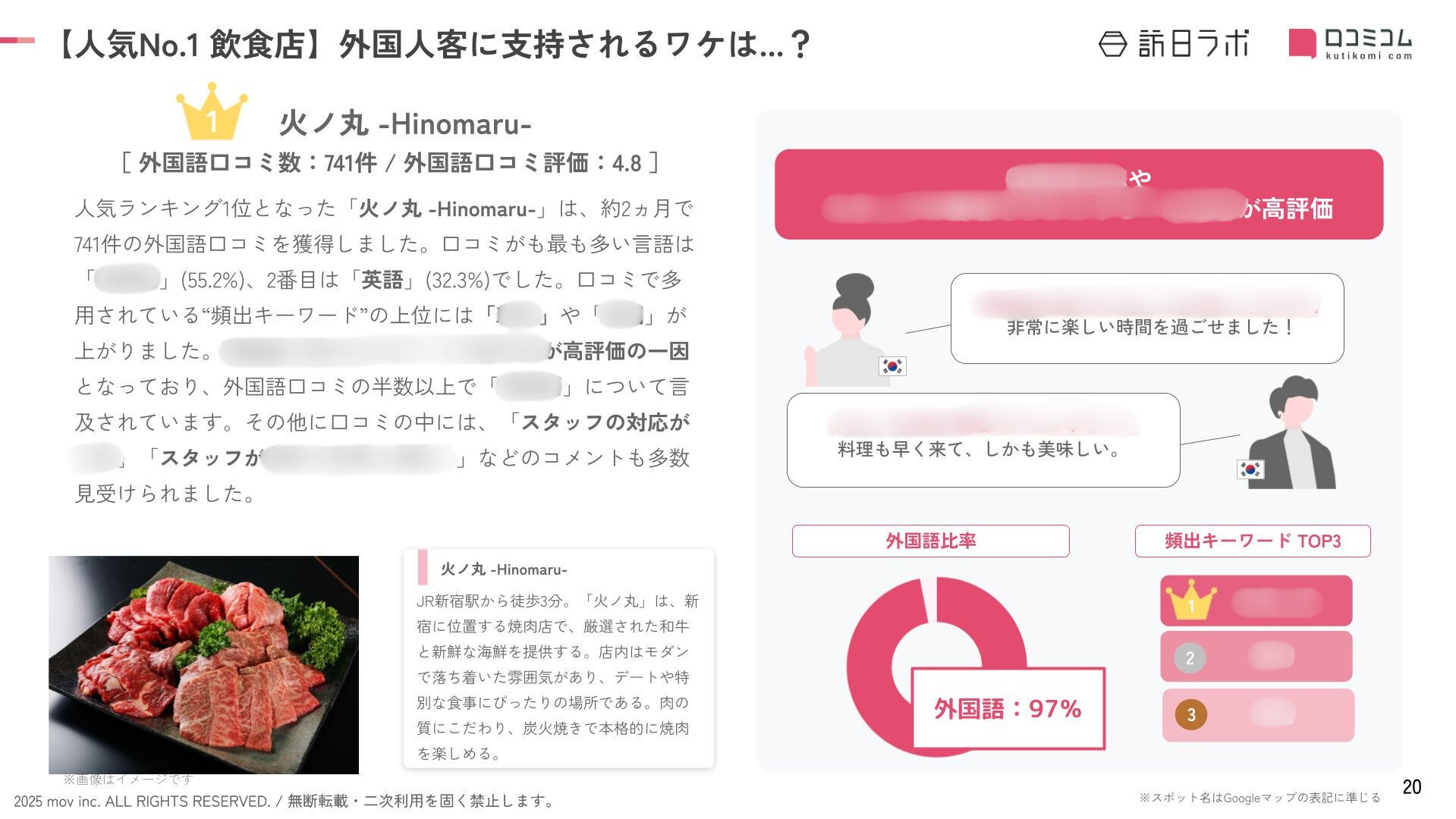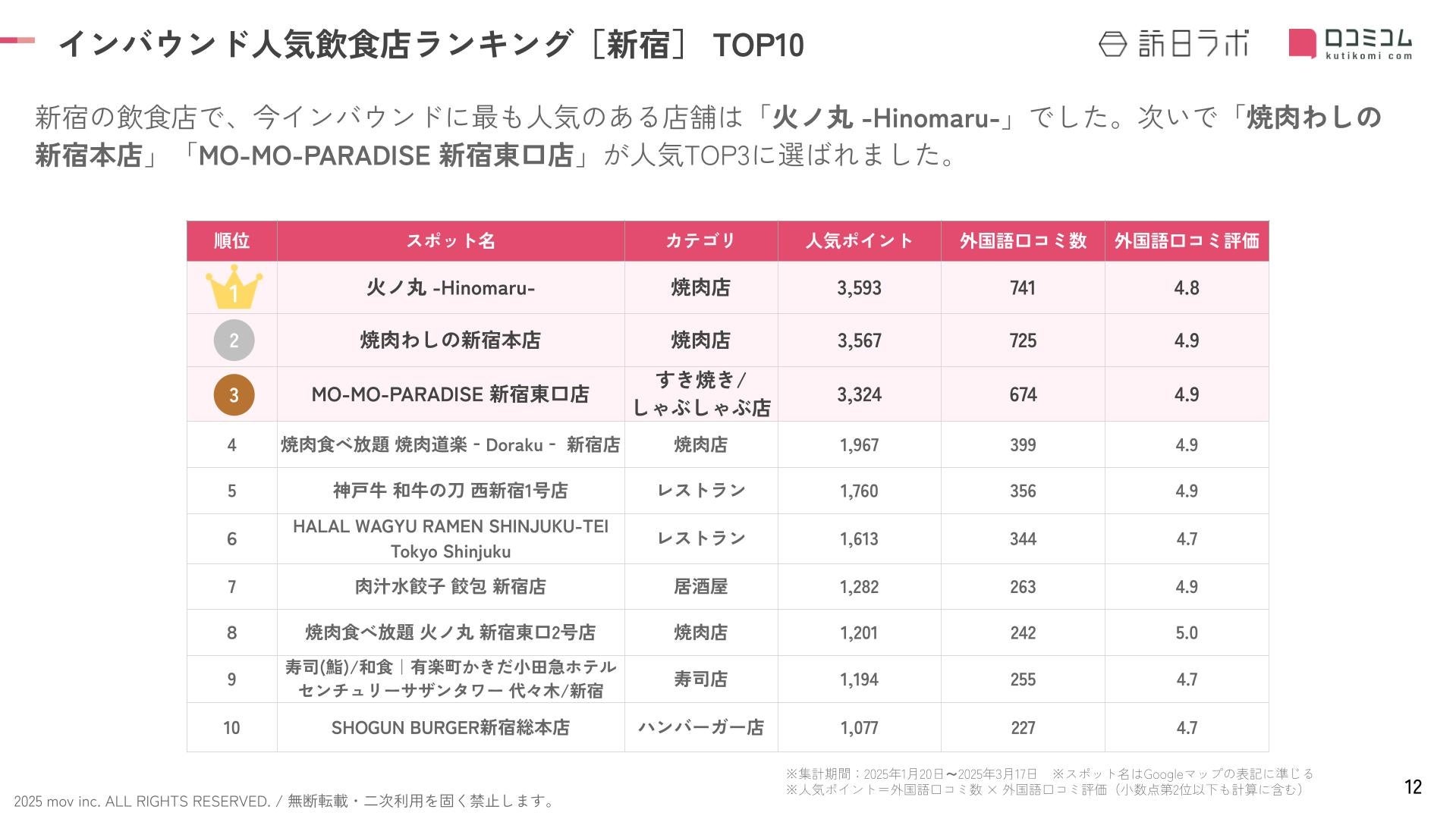 業界最大級のインバウンドビジネスメディア「訪日ラボ」及び 店舗向け集客一元化プラットフォーム「口コミコム」を運営する株式会社mov(代表取締役:渡邊 誠、本社:東京都渋谷区、以下mov)は、新宿エリアの飲食店に寄せられた最新の口コミデータから、独自の『インバウンド人気観光地ランキング』を発表しました。