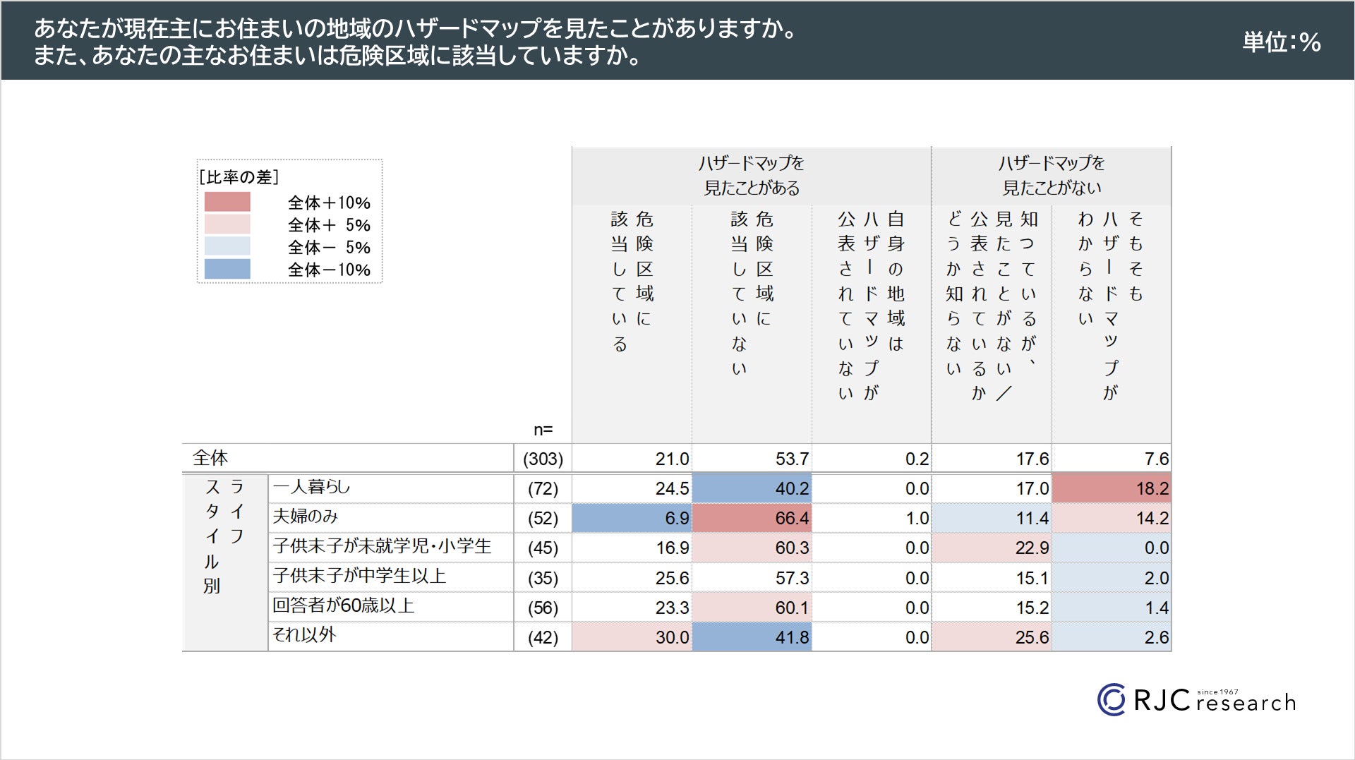 ● ライフスタイル別でみると 「一人暮らし」 と 「夫婦のみ」 の世帯で 「そもそもハザードマップがわからない」 と回答している人の割合が他の層よりも高く、家庭の人数が少ないほどハザードマップを認知していない傾向がある。