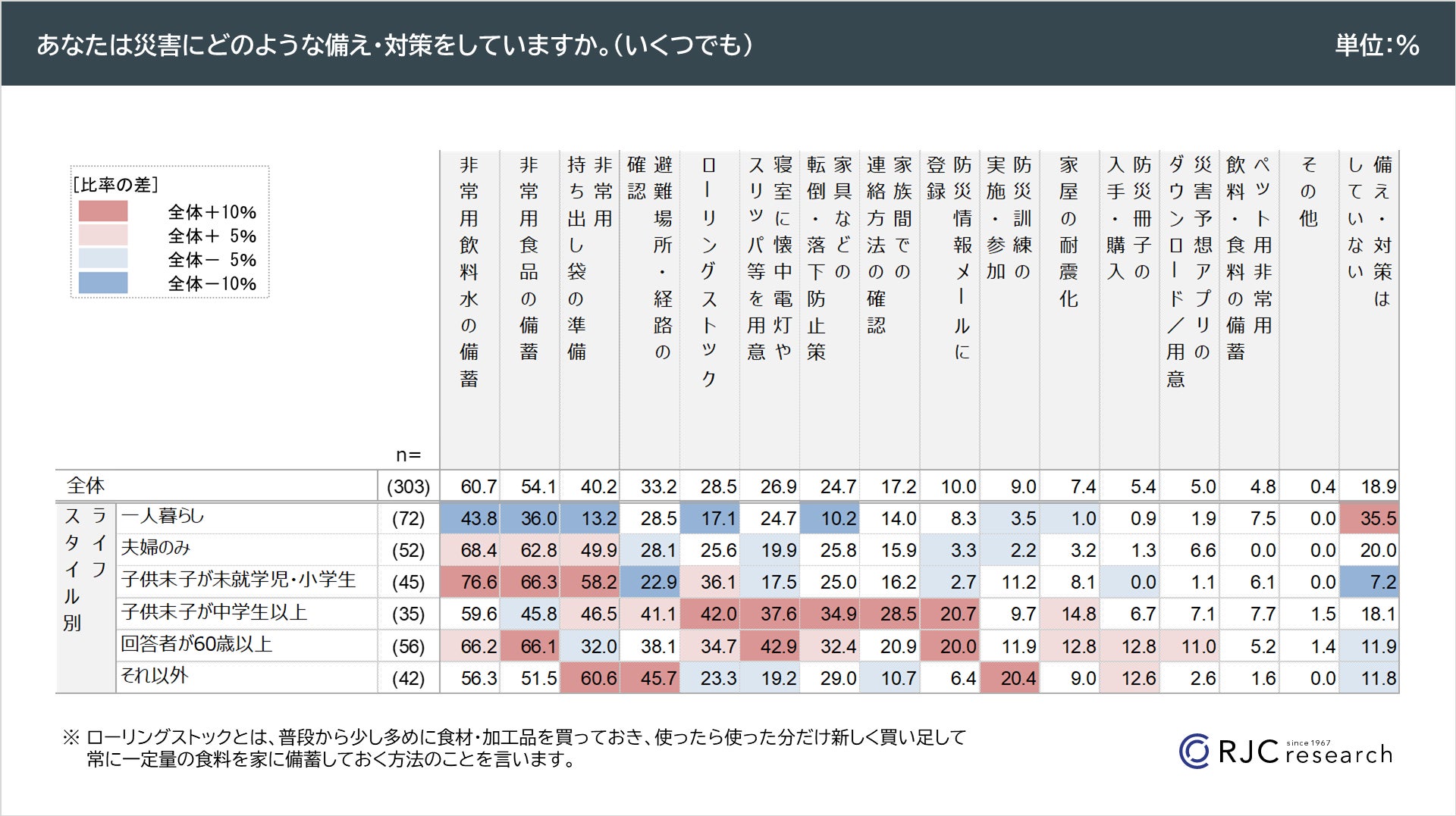 ● ライフスタイル別でみると、一人暮らしの世帯は 「備え・対策を全くしていない割合が三割以上」 と他の層と比べて高い傾向にある。