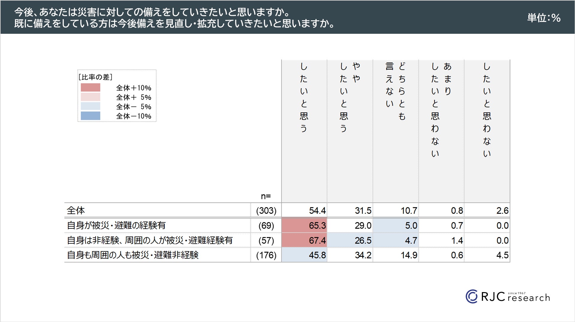 ●「自身が被災・避難の経験有」 「自身は非経験、周囲の人が被災・避難経験有」 の、自分や周囲の人が被災・避難の経験があると、 「備えや備えの見直し・拡充を積極的にしたい」 という傾向がある。