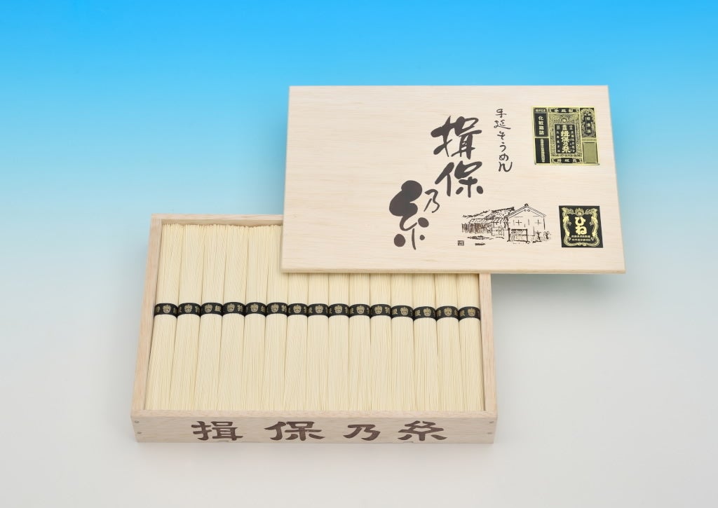 揖保乃糸は良質な小麦粉、揖保川の清流の水、赤穂の塩といった厳選された原料を使用し、伝統的な製法・工程を守りながら、熟練した職人が丹精込めて作る逸品です。1年間じっくり熟成させた「ひねもの」はコシが強く煮崩れしにくいため、いろいろな調理方法に活用できます。
