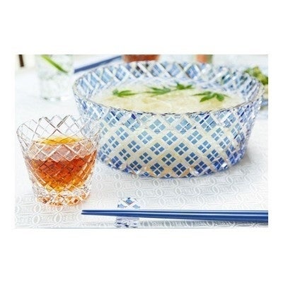 鮮やかな青の色被せクリスタルガラスに、江戸切子伝統文様の「矢来重(やらいがさね)」を施したそうめん大鉢と、そば猪口のセットです。涼しげな青いうつわは食卓に涼を運び、シンプルなカット柄は盛り付けたお料理を美しく引き立てます。