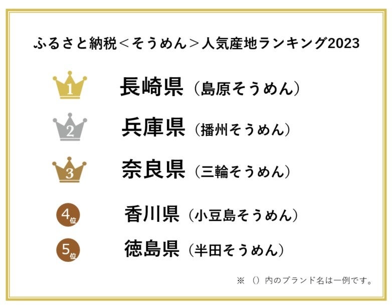 2023年の「そうめん」カテゴリの寄付件数を基にした人気産地ランキングでは、長崎県が1位となりました。続く2位には、そうめんの三大産地の1つであり、生産量日本一(※)の「揖保乃糸」で有名な兵庫県がランクイン。三大産地の残りの2県である奈良県と香川県が、それぞれ3位と4位にランクインしました。奈良県の三輪地区は、そうめん発祥の地ともいわれています。