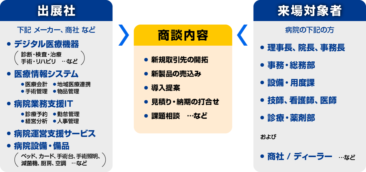 病院・介護・クリニック・薬局・感染症対策に関わる製品・技術・サービスが一堂に出展しているため、幅広いターゲットへ訴求することができます。
