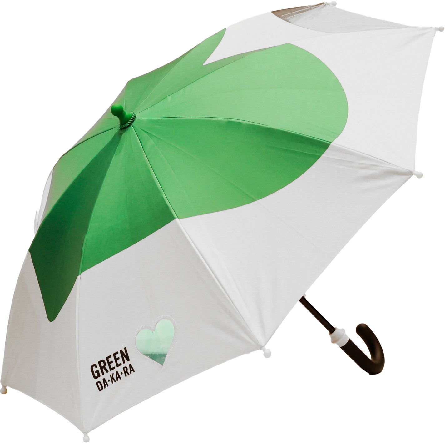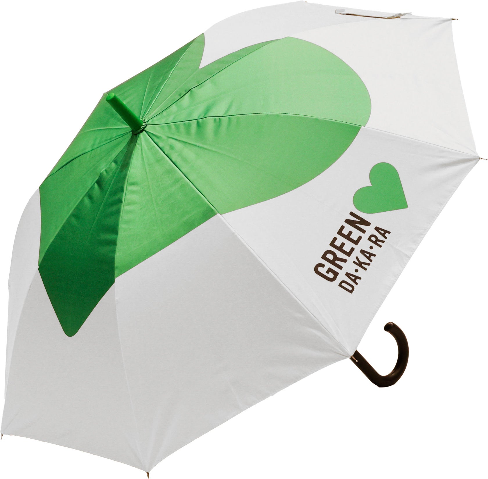 「GREEN DA・KA・RA」のロゴマークでおなじみのグリーンハートのデザインをあしらったオリジナルの 日傘で、“おとな用”と“こども用”があり、親子おそろいで使うことができます。“こども用”の日傘の生地には、「GREEN DA・KA・RA」ブランドロゴのグリーンハート部分に光を通す素材を使用しており、日傘をまっすぐ差すと足元にハートがきれいに映る、遊び心のあるデザインに仕上げました。子どもが楽しみながら、自然と正しい差し方を身につけられるよう工夫しています。