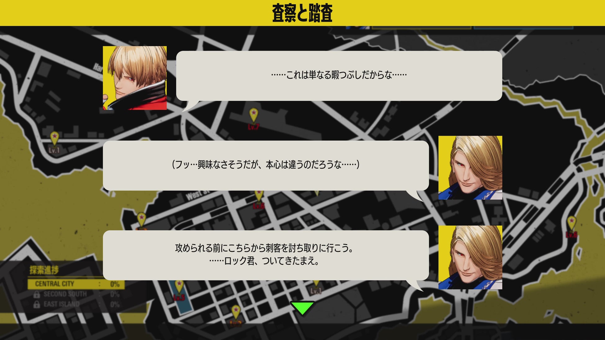 「アーケードモード」では、サウスタウンを舞台に、「ギース」の遺産を巡る物語が展開。母、息子、兄、師匠、宿敵、友人・・・。様々な想いを胸に秘めたファイターたちの宿命が交錯し、これまでの謎が解き明かされていく。