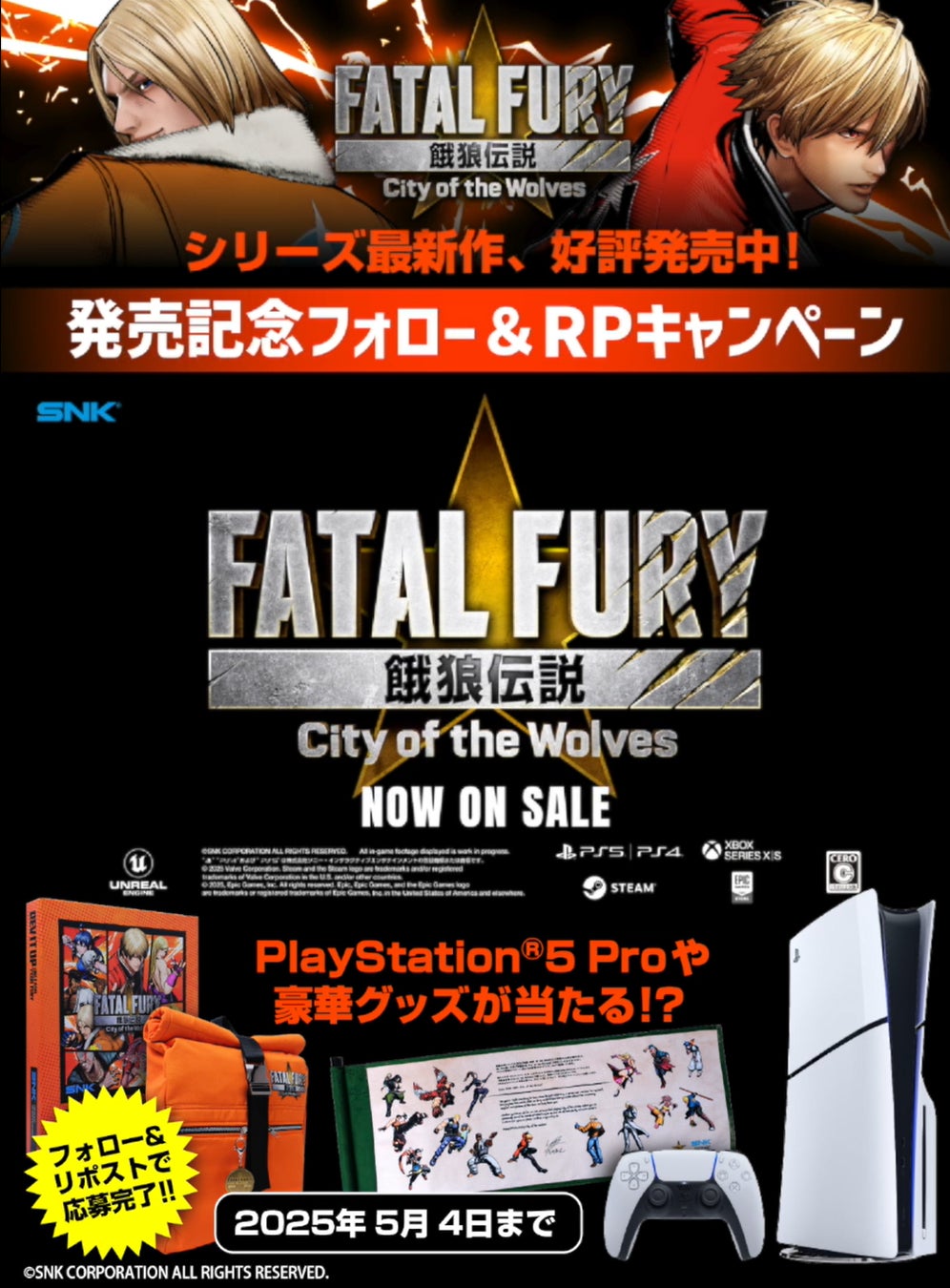 株式会社SNK (本社:大阪府大阪市、代表取締役社長:松原 健二)は、新作格闘ゲーム『餓狼伝説 City of the Wolves』を、PlayStation®5/PlayStation®4/Xbox Series X|S/Steam/Epic Games Storeで、本日、2025年4月24日に発売したことをお知らせいたします。