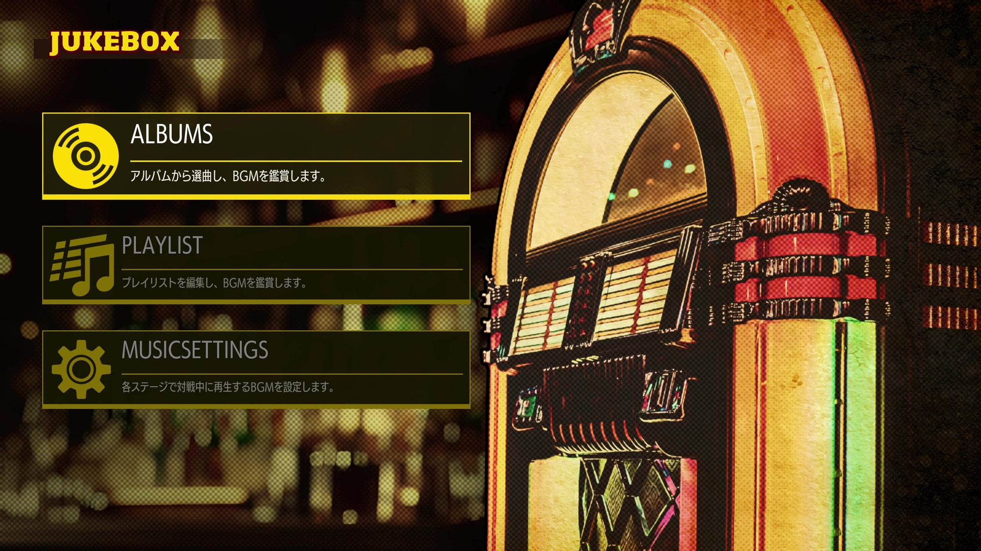 『餓狼伝説』シリーズに加え、サウスタウンを舞台にした格闘ゲーム『龍虎の拳』シリーズの人気楽曲を収録した「JUKEBOX」を搭載。オリジナルのプレイリストの作成や、各種モードのBGMを好きな曲にカスタマイズすることも可能!