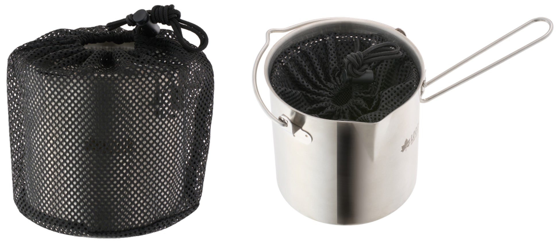 本体サイズの収納袋と、ザル専用の収納袋が付属しており、どちらも通気性の良いメッシュ素材を採用。持ち運び時のガタツキを減らし、また、ザル単体での収納や保管に活躍。