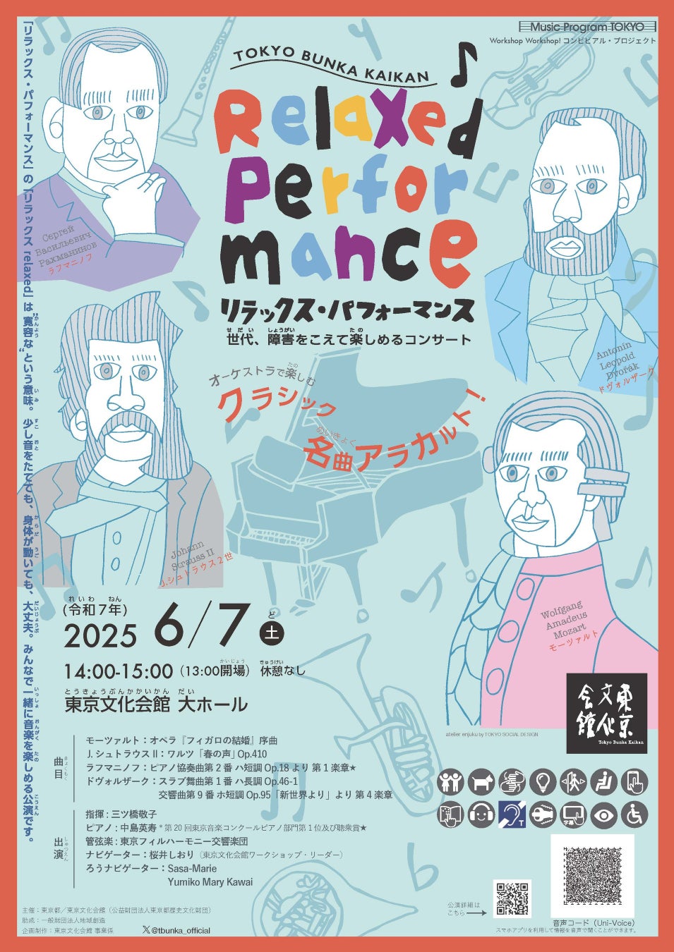「東京文化会館 リラックス・パフォーマンス」は通常の公演と異なり、障害・世代などをこえてあらゆる人が安心して音楽を楽しめる公演として2020年からはじめ、今年で6年目になりました。この公演では、自閉症やコミュニケーション障害、発達障害などにより劇場や音楽ホールでの従来の音楽鑑賞に不安がある方もご家族・ご友人・介助者と安心して鑑賞できると好評いただいております。